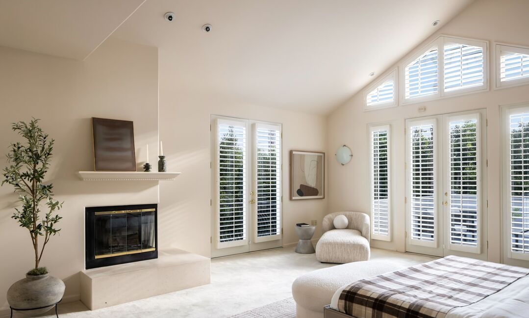 A serene primary bedroom suite featuring floor-to-ceiling shuttered doors and skylights that flood the space with natural light, anchored by a striking linear fireplace and complemented by organic modern furnishings in soft neutrals. The generous proportions, vaulted ceiling, and layering of natural materials create a sophisticated yet inviting sanctuary with exceptional attention to light control and architectural detail.