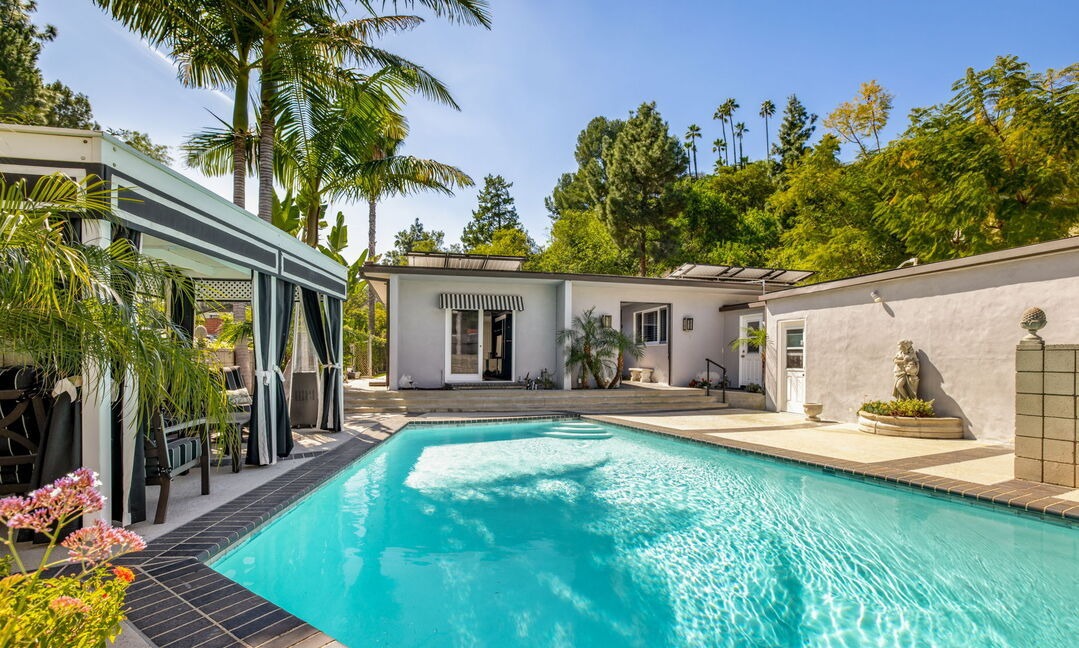 A stunning contemporary poolside oasis featuring a brilliantly turquoise lap pool surrounded by sleek concrete decking and minimalist white stucco structures with black metal accents. The space seamlessly blends indoor and outdoor living with a modern pergola, integrated shade structures, and lush tropical landscaping that creates an elevated resort-like atmosphere perfect for entertaining or relaxation.