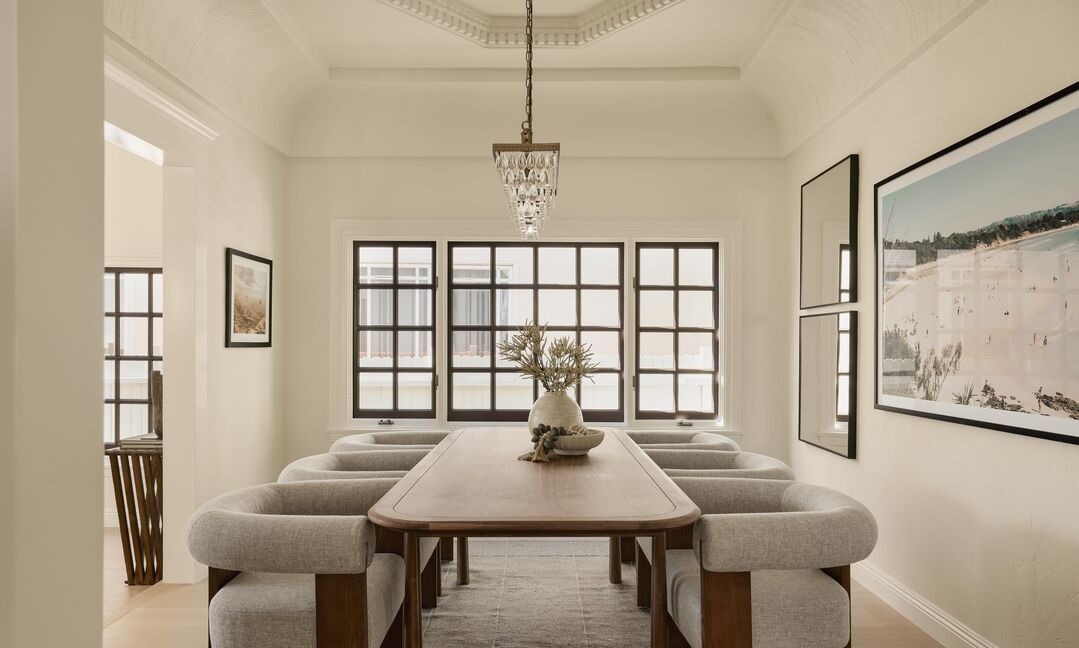 An elegantly formal dining room featuring a sculptural walnut table with curved upholstered banquette seating in warm linen, punctuated by a delicate crystal chandelier and framed by dramatic black-mullioned windows overlooking the exterior. The coffered ceiling, crown molding, and neutral cream palette create a serene, sophisticated atmosphere that balances traditional architectural details with contemporary minimalism.