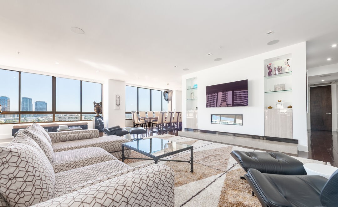 A sophisticated open-concept living room featuring expansive floor-to-ceiling windows with panoramic city views, anchored by custom white built-in shelving with a contemporary fireplace. The space blends transitional elegance with organic modern warmth through neutral tones, layered seating in geometric patterns, and thoughtful lighting that maximizes natural illumination and creates an airy, gallery-like ambiance.