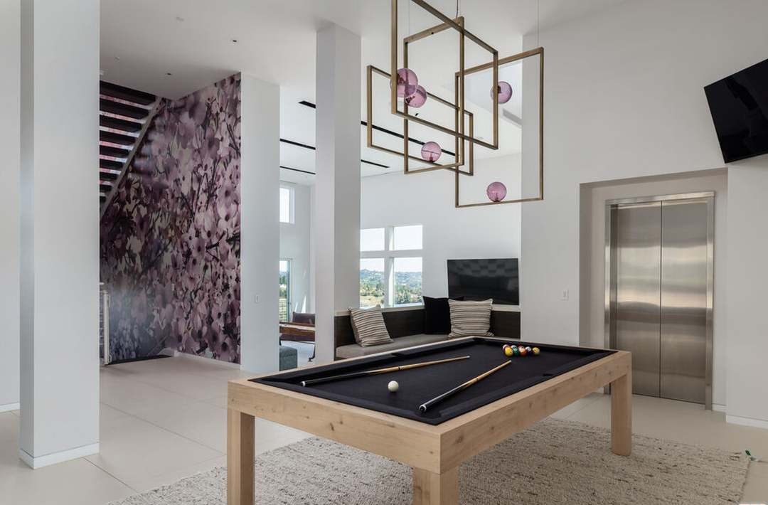 A sophisticated game room featuring a light wood pool table with black felt and brass hardware, anchored by a striking brass geometric pendant chandelier with amethyst accents. The space seamlessly blends transitional and organic modern elements with abundant natural light from floor-to-ceiling windows, clean white walls, warm wood tones, and a moody purple floral accent wall, creating an elegant yet inviting entertainment space.