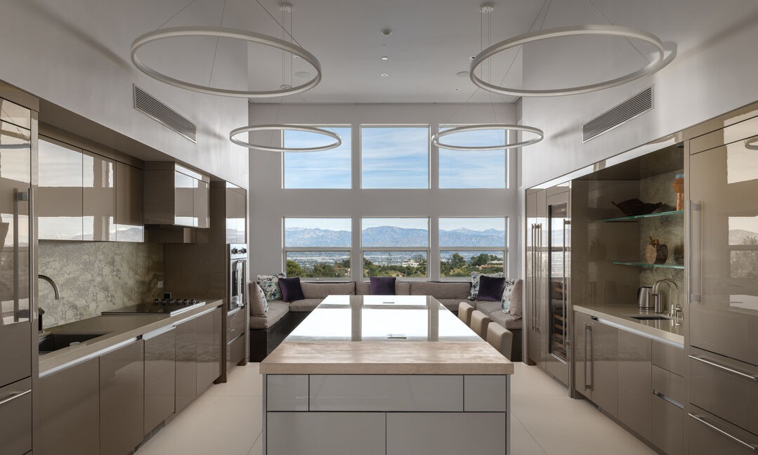 Waterfall IslandFloor To Ceiling WindowsStatement LightingMountain ViewsOpen ConceptHigh CeilingsCustom MillworkPendant Lighting