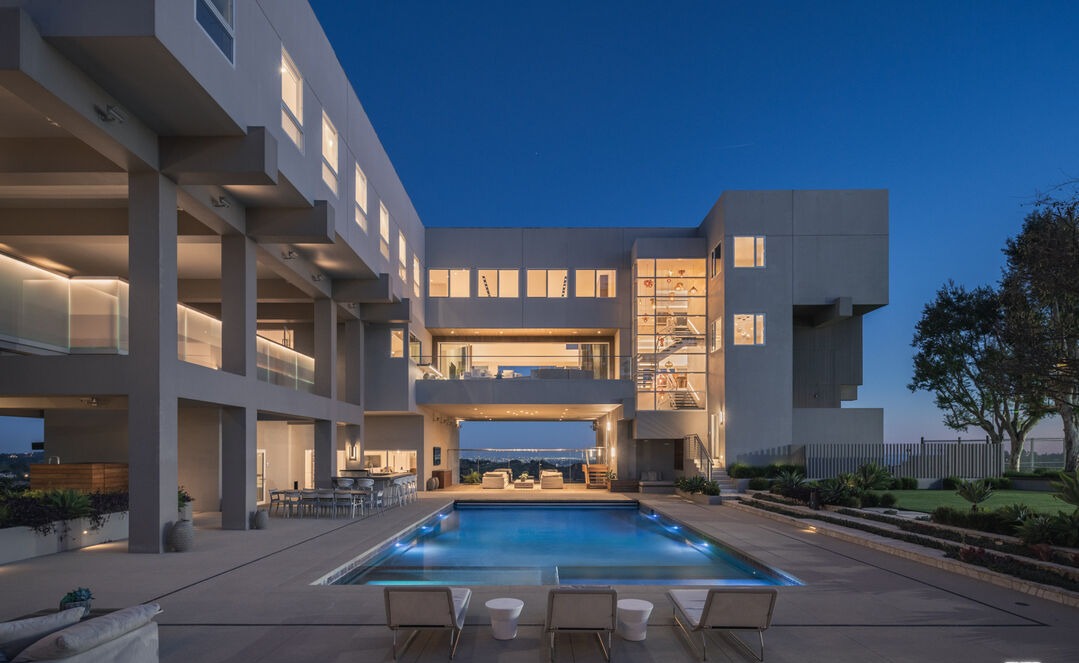 A striking modern luxury pool area featuring a sleek rectangular pool with integrated lighting, anchored by a contemporary white concrete structure with cantilevered forms and expansive glass walls that seamlessly blend indoor and outdoor living. The minimalist design emphasizes clean lines, neutral tones, and sophisticated architectural geometry, while warm wood accents and carefully curated outdoor furniture provide subtle warmth to the cool-toned palette.