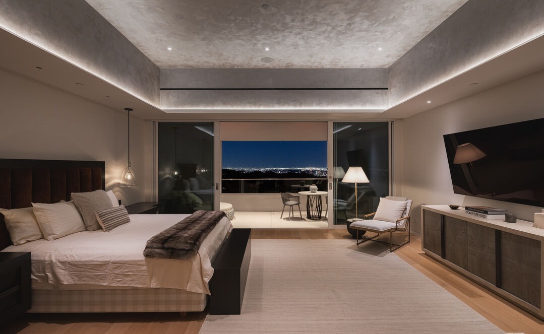 A stunning ultra-luxury primary bedroom suite featuring expansive floor-to-ceiling glazing with panoramic nighttime city views, sophisticated tray ceiling with integrated LED accent lighting, and a seamless blend of warm neutrals with natural wood accents and black metalwork. The room exemplifies organic modern design with its emphasis on natural light, clean lines, and high-end materiality—including polished concrete ceiling details and custom light wood millwork—all composed for maximum visual impact and serene comfort.