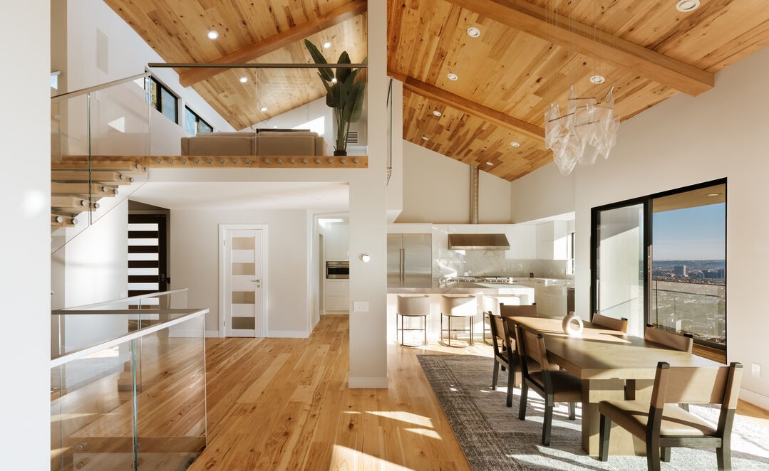 A stunning open-concept great room featuring dramatic vaulted wood-plank ceilings with exposed timber beams, abundant natural light from expansive floor-to-ceiling windows framing expansive views, and warm hardwood flooring throughout. The space seamlessly integrates living, dining, and kitchen zones with a loft mezzanine above, exemplifying modern mountain lodge luxury with clean lines, natural materials, and sophisticated minimalist furnishings.