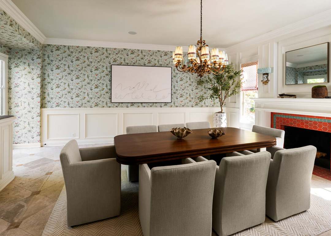 An elegantly formal dining room featuring sophisticated transitional design with traditional white wainscoting, floral wallpaper, and custom millwork accented by a striking brass chandelier and fireplace. The warm, collected aesthetic—anchored by a dark walnut dining table, neutral upholstered chairs, and abundant natural light—creates a refined yet inviting space that balances classic architectural details with contemporary comfort.