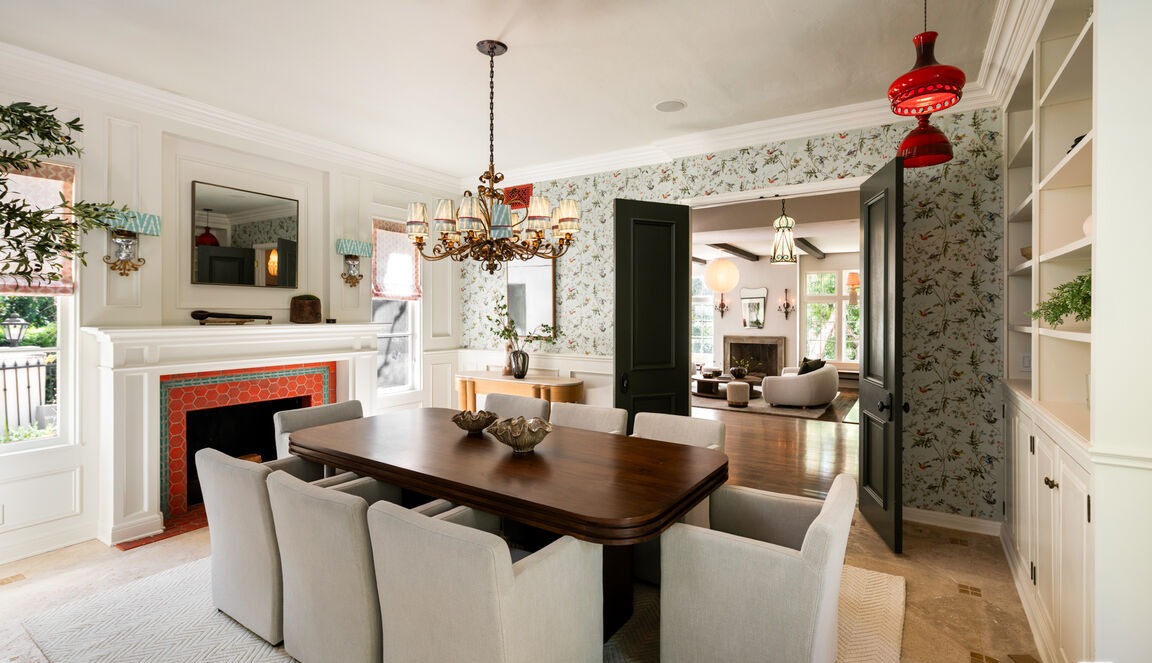 An elegant transitional dining room featuring a rich dark wood table with cream upholstered chairs, anchored by a striking red geometric fireplace surround and classical brass chandelier. The space seamlessly blends traditional architectural details—wainscoting, crown molding, and ornate millwork—with contemporary floral wallpaper and open-concept flow, creating a sophisticated and inviting formal dining environment with abundant natural light.