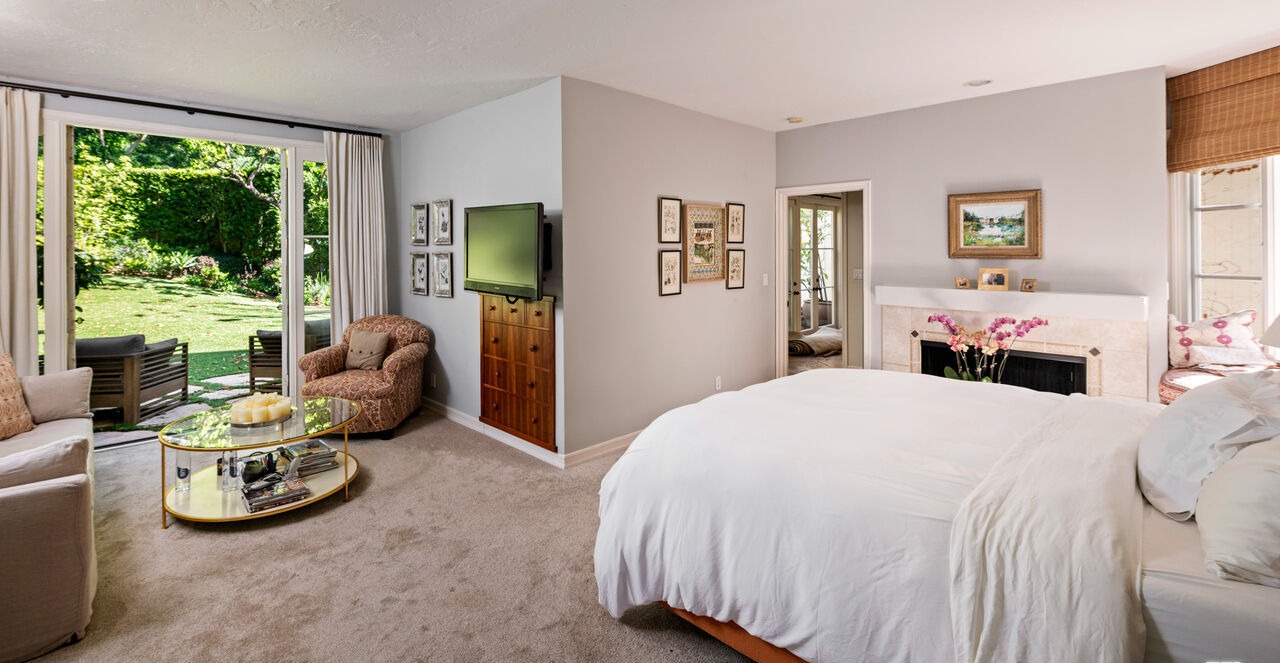 An elegantly appointed primary bedroom suite featuring a serene neutral palette anchored by a crisp white bed, complemented by warm wood accents, a marble fireplace with pink floral arrangement, and abundant natural light from expansive windows overlooking manicured gardens. The space seamlessly blends transitional architectural details with organic modern furnishings, creating a sophisticated and restful sanctuary.