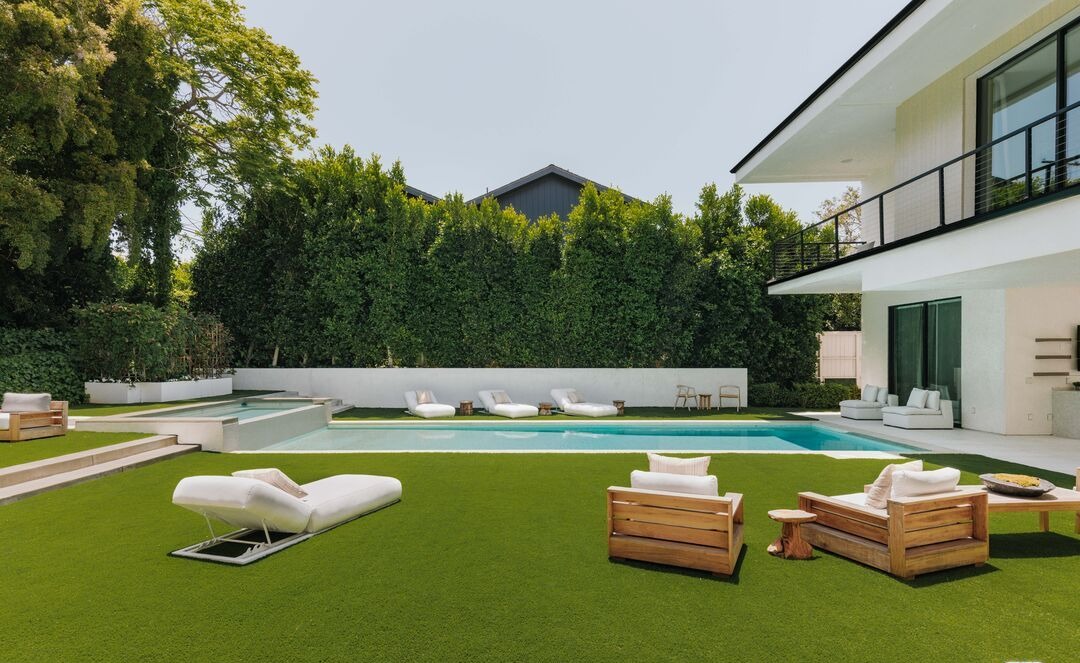 A stunning contemporary pool area featuring a geometric infinity-edge pool in striking turquoise, set within a minimalist white concrete deck bordered by manicured synthetic grass and tall hedged privacy screens. The space showcases luxury modern design with organic elements—natural wood lounge furniture with cream cushions, clean-lined architecture, and sophisticated outdoor living that epitomizes high-end Southern California residential design.