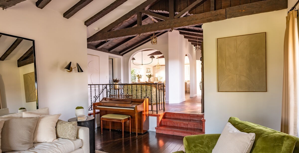 A sophisticated split-level living space featuring soaring vaulted ceilings with dramatic exposed timber beams and abundant natural light from arched openings. The room seamlessly blends traditional architectural elements (beamed ceilings, arched passages) with contemporary furnishings in a warm, earthy palette of cream, olive green, and warm wood tones, anchored by a mid-century modern piano and accented with brass statement lighting.