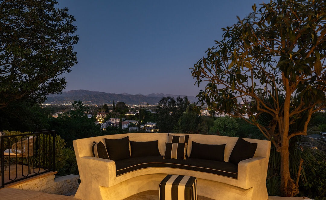 An ultra-luxe outdoor patio featuring a stunning curved sectional sofa upholstered in golden velvet with black and striped accent pillows, positioned to showcase panoramic views of a sprawling metropolitan valley. The dramatic architectural composition, high-quality furnishings, and curated color palette of gold, black, and cream epitomize contemporary desert-modern glamour with editorial-quality styling and photography.