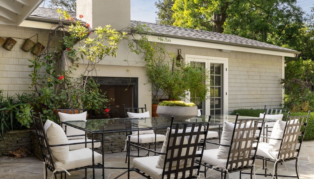 A sophisticated outdoor patio featuring clean-lined black metal dining furniture with cream cushions arranged on a stone terrace, seamlessly connected to a modern white shiplap cottage with large glass doors. The space is layered with lush greenery, hanging planters, and potted flowers, creating an inviting yet refined indoor-outdoor living environment with abundant natural light and balanced neutral tones punctuated by vibrant red blooms.