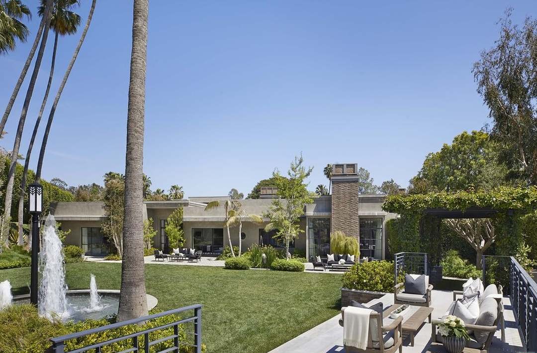 An expansive modern patio and grounds featuring a sophisticated outdoor living space with curated lounge seating, geometric landscaping, and a sculptural water fountain framed by tall palm trees. The design exemplifies high-end desert modern aesthetic with warm neutral tones, clean lines, and abundant natural light creating an airy, resort-like atmosphere.