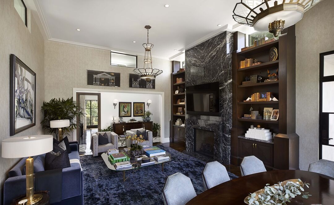 A sophisticated formal living room seamlessly transitioning to dining, anchored by a dramatic black marble fireplace with custom shelving and brass hardware, featuring a navy velvet sofa, geometric lighting, and museum-quality styling that exudes glamorous elegance and refined luxury.