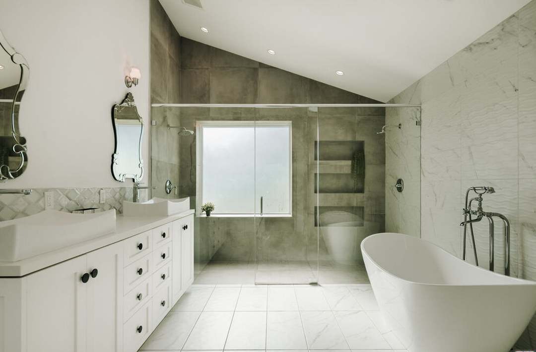 Countertop: MarbleCabinets: White ShakerCabinet Color: WhiteFlooring: MarbleCeiling: StandardVanity: Marble TopShower: Frameless GlassTub: FreestandingTile: Large Format