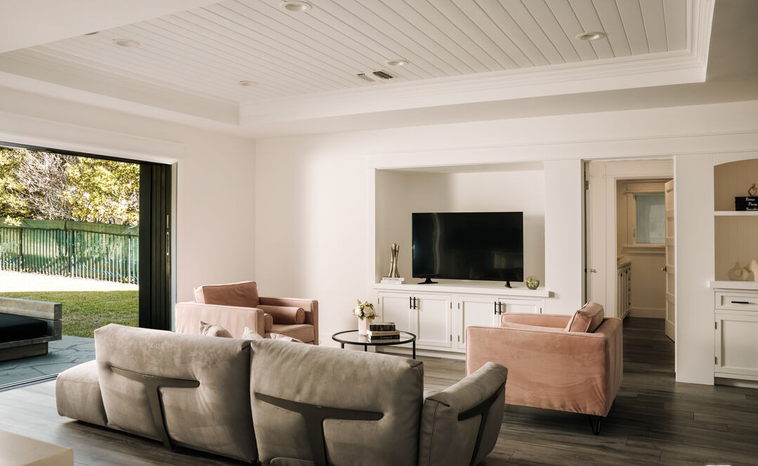 A sophisticated open-concept living room featuring a transitional design that seamlessly blends traditional architectural details—coffered ceiling, custom white millwork, and crown molding—with contemporary organic materials and warm, neutral furnishings. Floor-to-ceiling sliding glass doors flood the space with natural light and connect to an expansive outdoor landscape, while curated terracotta and cream seating pieces and a layered entertainment wall create an inviting yet refined atmosphere.