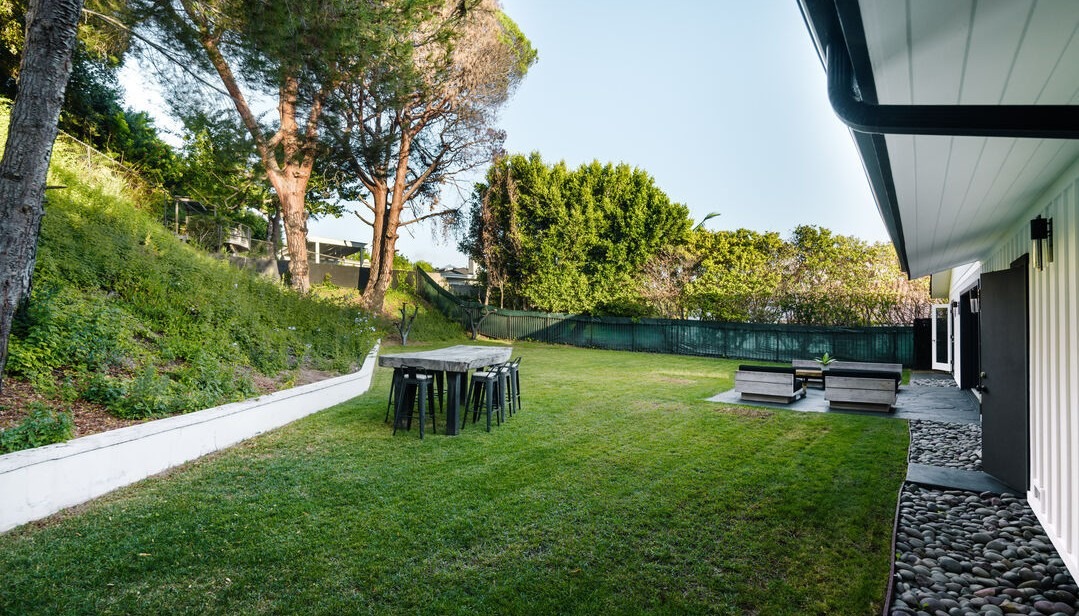 A sophisticated modern patio seamlessly integrating indoor-outdoor living with mature landscape design, featuring minimalist furnishings, clean architectural lines, and a carefully curated black-and-white palette that emphasizes serenity and contemporary elegance. The generous lawn space, mature trees, and hidden pergola create a private retreat while the dark metal accents and concrete paving provide a striking counterpoint to lush greenery.