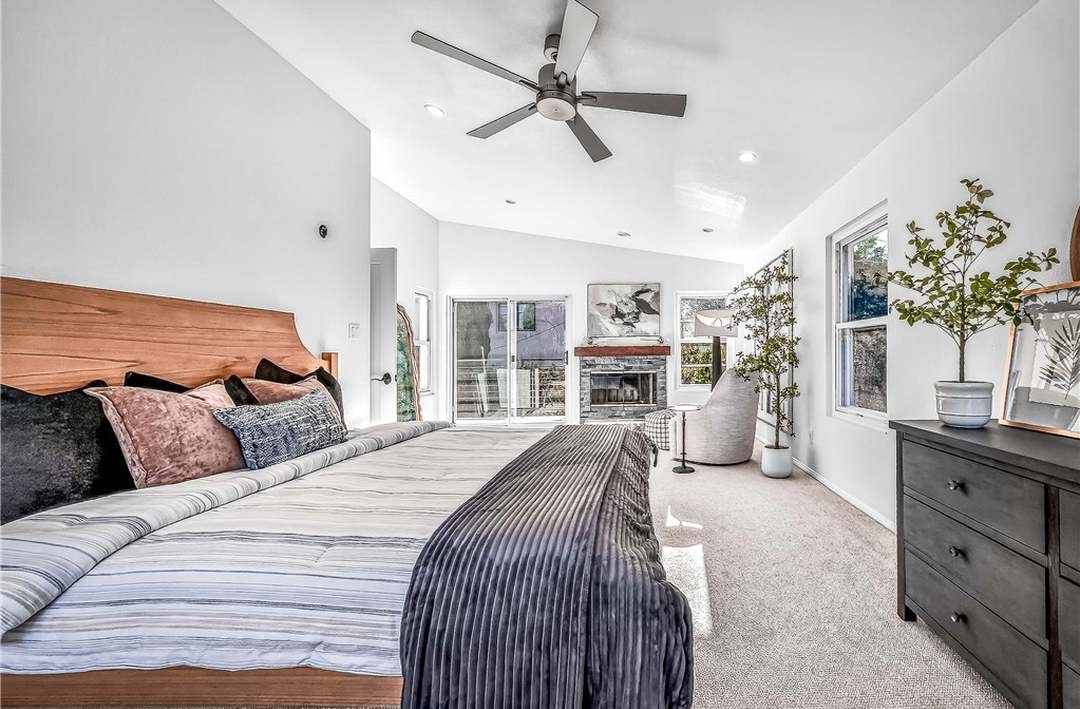 A stunning primary bedroom suite bathed in natural light, featuring a warm wood platform bed against white walls with tray ceiling and integrated ceiling fan. The sophisticated palette of soft whites, warm wood tones, and dusty rose accents is anchored by a charcoal fireplace accent wall and complemented by carefully curated indoor plants and modern furnishings that balance warmth with contemporary elegance.