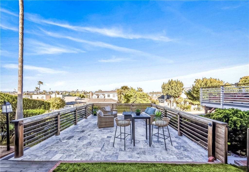 An elevated rooftop or upper-level patio featuring polished gray marble flooring, sleek black metal railings, and contemporary furnishings including wicker seating and a bar-height dining table. The space offers expansive views of a Southern California residential neighborhood with abundant natural light and an sophisticated yet relaxed outdoor living atmosphere.