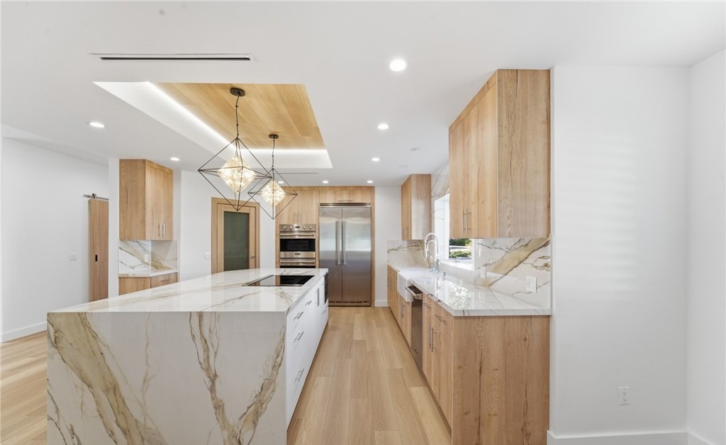 Countertop: MarbleCabinets: Natural WoodCabinet Color: Light WoodFlooring: HardwoodBacksplash: Marble SlabCeiling: Tray
