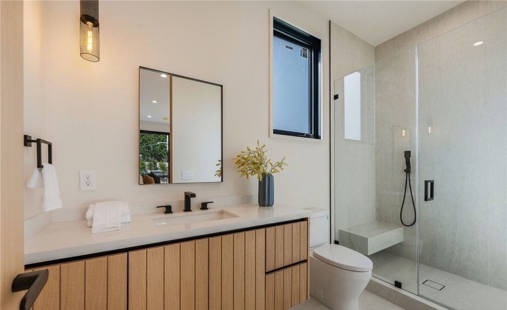 Floating VanityWalk In ShowerFrameless Glass ShowerStatement LightingLarge Format TilePendant LightRecessed LightingVertical Wood Paneling CabinetryHigh Window