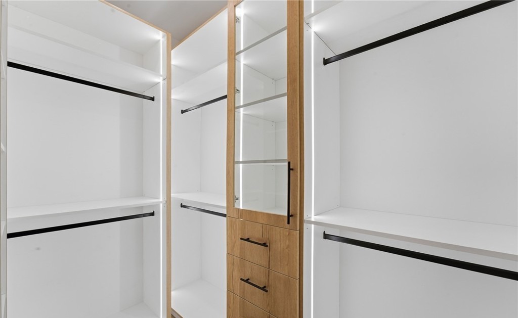 A sophisticated walk-in closet featuring clean-lined custom cabinetry in natural wood with white painted shelving and integrated black metal rods and hardware. The minimalist design emphasizes organization and functionality with built-in drawers, open shelving, and accent lighting, creating a spa-like closet experience.