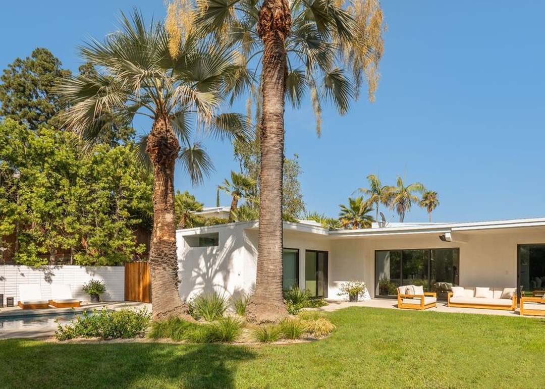 A stunning contemporary outdoor living space featuring a resort-style patio with clean modern architecture, mature palm trees, and seamless indoor-outdoor flow through expansive glass doors. The minimalist design emphasizes natural materials, lush landscaping, and a serene pool area that exemplifies high-end Southern California luxury living.
