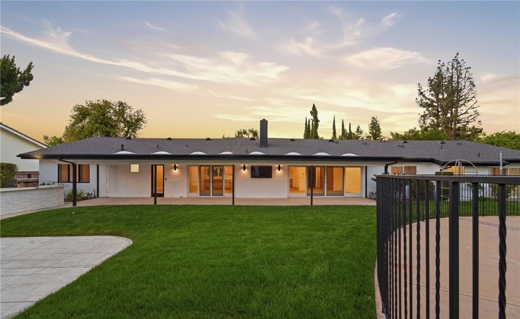 A stunning contemporary residential patio featuring a sprawling manicured lawn, clean-lined covered structure with elegant pendant lighting, and black metal railings that provide modern definition against crisp white stucco walls. The space exemplifies modern desert/California design with warm earth tones, minimal ornamentation, abundant natural light, and seamless indoor-outdoor integration.