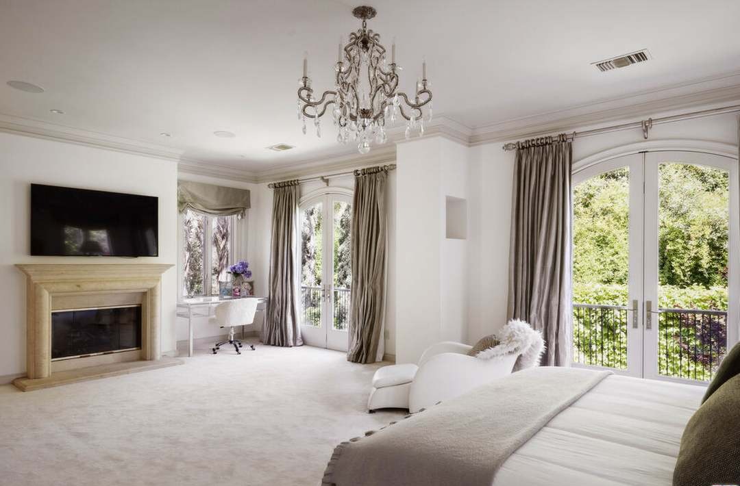 A serene primary bedroom suite featuring coffered ceilings, a wood-burning fireplace, and abundant natural light from floor-to-ceiling windows opening to a private balcony. The space exemplifies transitional luxury with refined traditional details—crown molding, custom millwork, and an ornate brass chandelier—paired with contemporary furnishings and a soft, neutral palette of whites, creams, and warm taupe tones.