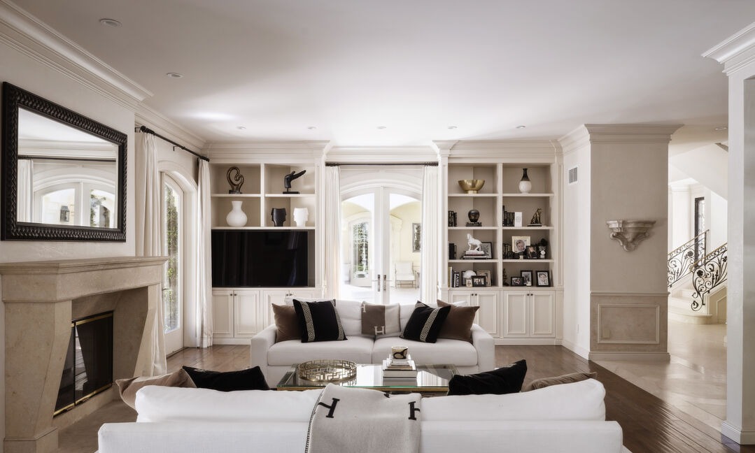A sophisticated formal living room featuring pristine transitional design with coffered ceilings, extensive white built-in millwork, and a substantial fireplace anchoring the space. The room balances architectural elegance with contemporary comfort through a neutral palette, premium hardwood flooring, and museum-quality furnishings including sleek white sofas accented with black pillows and curated décor.