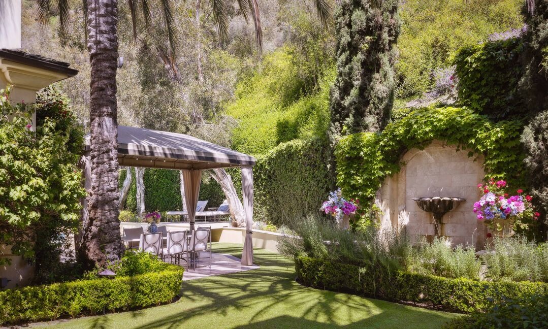 An exquisite Mediterranean-inspired patio garden featuring lush ivy-covered stone walls, tall cypress and palm trees, and a sophisticated covered pergola with striped awning that frames an elegant outdoor seating area. The space epitomizes old-world European elegance reimagined for Southern California luxury living, with abundant blooming flowers and manicured hedges creating a serene, resort-like retreat.