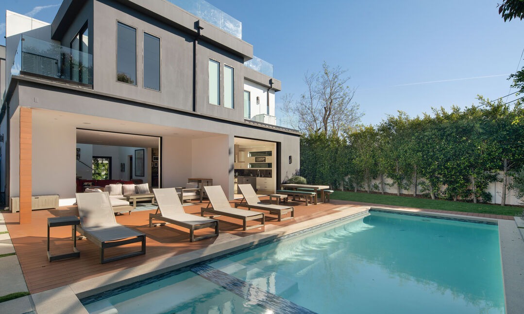 A stunning modern pool area featuring a resort-style rectangular pool with turquoise water, anchored by a sophisticated gray and white two-story residence with floor-to-ceiling glazing. The warm composite wood decking, curated lounge furniture with cream cushions, and seamless indoor-outdoor flow exemplify contemporary luxury design with premium finishes and meticulous landscape integration.