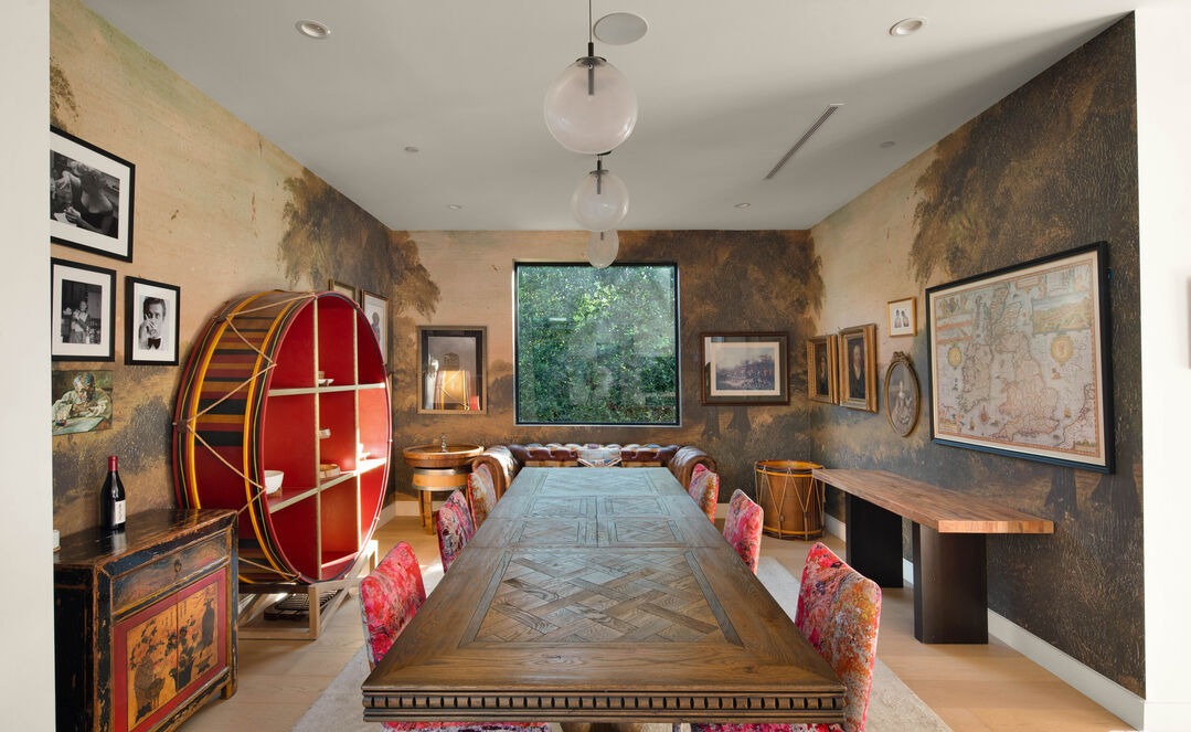 A luxuriously appointed game room featuring richly textured venetian plaster walls in warm earth tones, accented with an eclectic collection of framed art, antique furnishings, and a statement red barrel-shaped cabinet. The space masterfully blends old-world European elegance with contemporary comfort, anchored by a substantial billiards table with pink upholstered seating and sophisticated brass-finished pendant lighting.