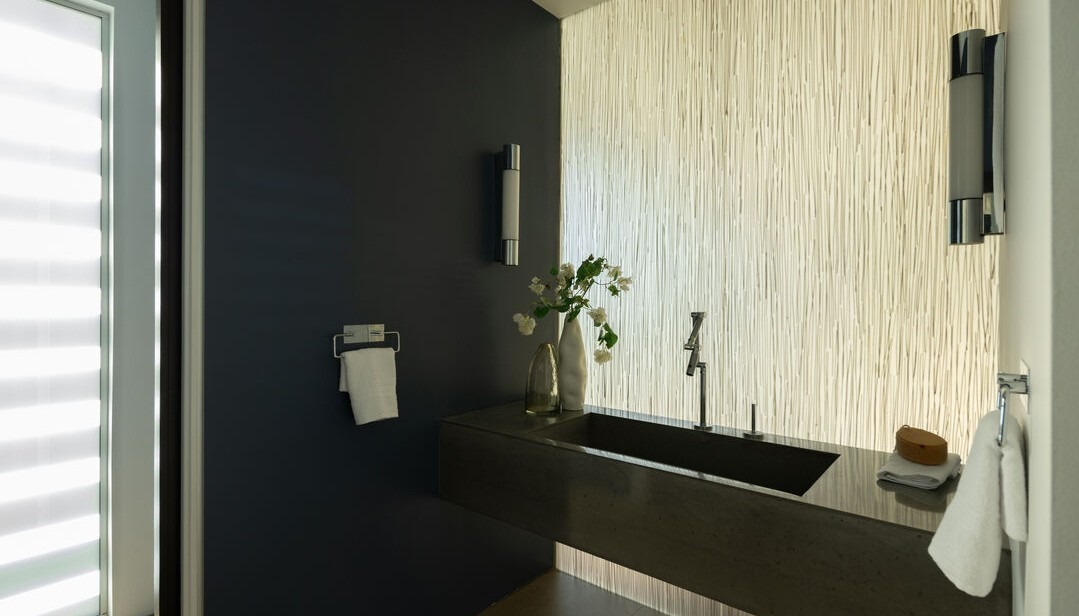 A minimalist primary bathroom featuring a striking floating concrete vanity with a rectangular black sink and floor-to-ceiling white textured tile wall treatment, accented by modern black sconce lighting and matte black fixtures. The room balances dramatic dark walls with clean geometry, abundant natural light from the full-height window, and carefully curated organic accents like fresh greenery, creating a serene spa-like luxury retreat.