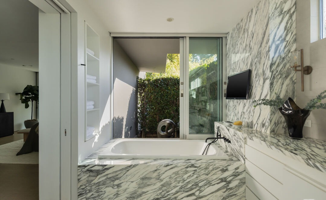 A stunning contemporary primary bathroom showcasing Italian marble throughout—walls, floors, and surfaces—paired with a minimalist floating white vanity and sculptural brass hardware. The spa-like space features a dramatic freestanding soaker tub and a frameless glass walk-in shower opening to a private outdoor courtyard, creating a seamless indoor-outdoor wellness sanctuary with abundant natural light.