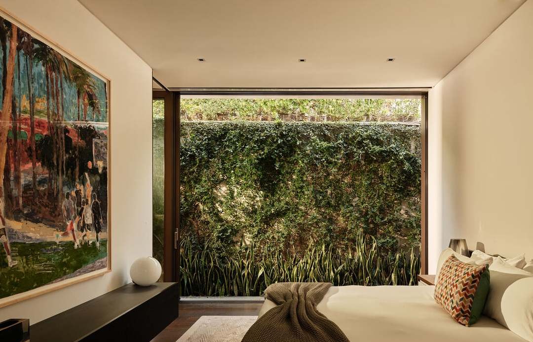 A serene, light-filled primary bedroom featuring floor-to-ceiling windows opening onto a lush green hedge privacy screen, creating a tranquil natural focal point. The space balances warm neutrals with organic textures—cream walls, dark wood low-profile furniture, natural linens, and curated artwork—exemplifying sophisticated organic modern design with seamless indoor-outdoor integration.