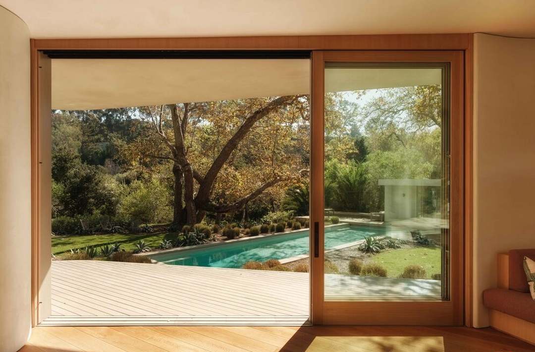 A serene poolside retreat seamlessly connecting interior and exterior through expansive sliding glass doors and a naturally integrated wooden deck. The space balances modern minimalism with organic landscaping, featuring a luminous turquoise pool framed by mature trees and native plantings that create a tranquil, resort-like atmosphere with warm earth tones and abundant natural light.