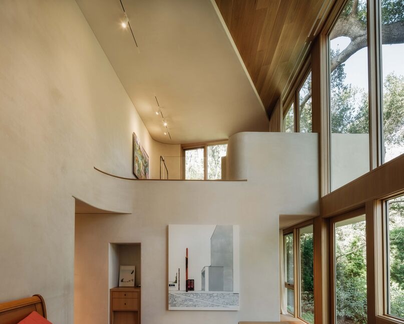 A sophisticated primary bedroom featuring soaring vaulted ceilings with warm wood detailing, expansive floor-to-ceiling windows framing lush greenery, and clean modernist lines softened by natural materials and warm earth tones. The space exemplifies organic modern luxury with its seamless integration of light, texture, and carefully curated furnishings.