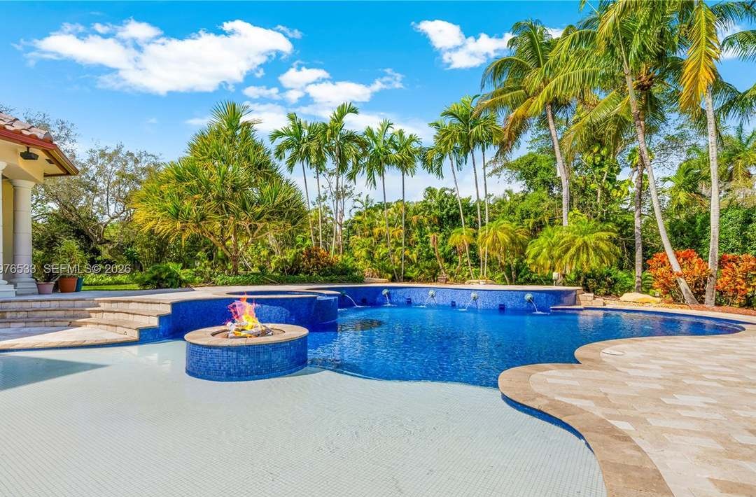 An exceptionally luxurious resort-style pool area featuring a stunning free-form pool with vibrant blue mosaic tile and a central fire pit island, surrounded by travertine and stone decking. The lush tropical landscape of soaring palm trees and mature vegetation creates an exclusive, high-end oasis aesthetic with abundant natural light and sophisticated outdoor entertaining spaces.