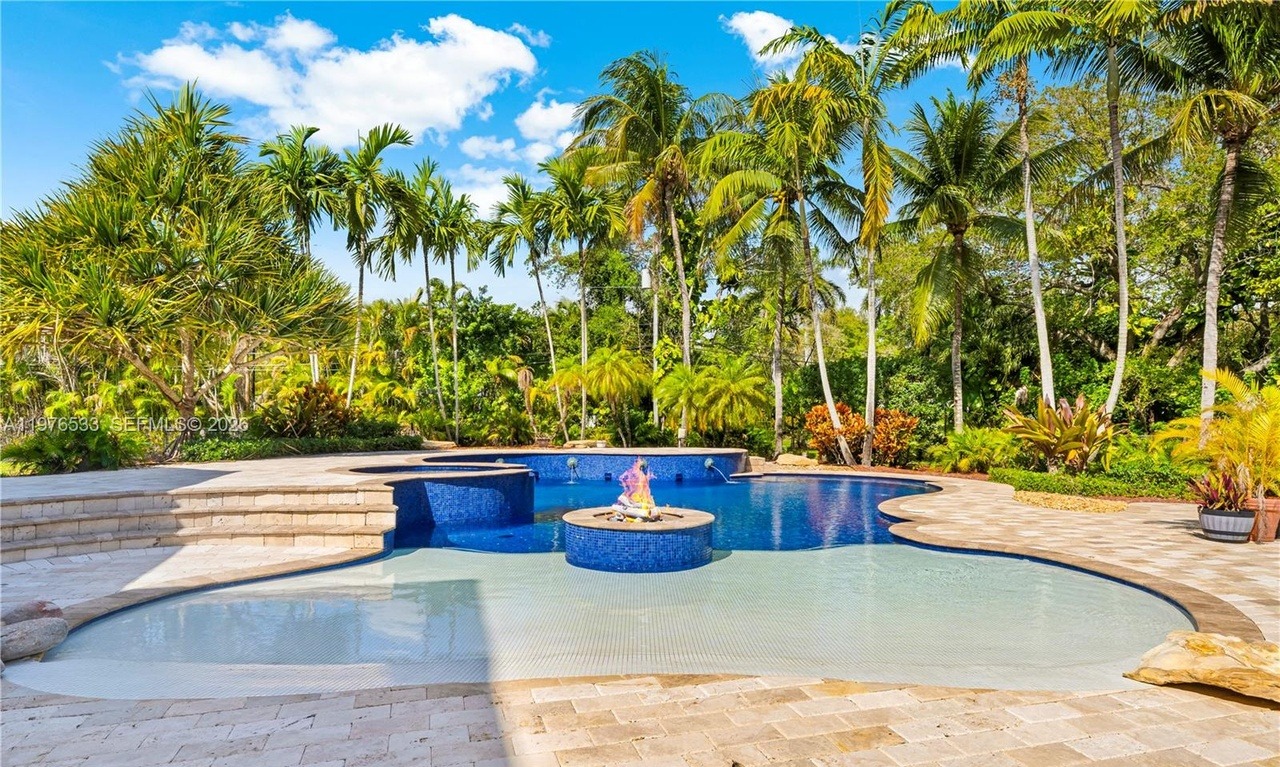A stunning resort-style pool area featuring a lagoon-shaped swimming pool with integrated spa and central fire pit island, surrounded by lush tropical landscaping with towering palms and exotic plantings. The sophisticated design blends luxury amenities with organic natural elements, creating an opulent yet serene tropical oasis with professional-grade finishes and meticulous landscaping.