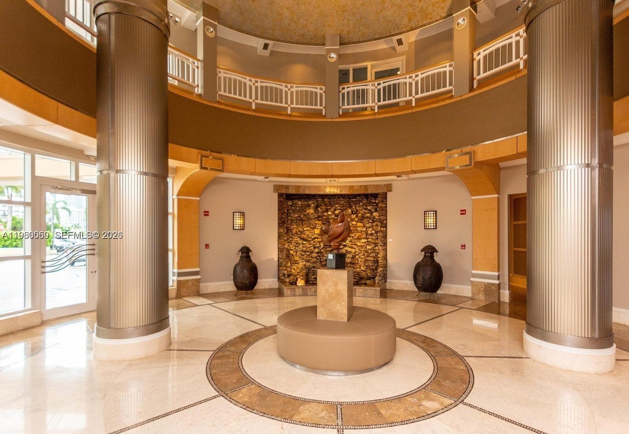 A breathtaking circular entryway gallery anchored by a domed ceiling and commanding central rotunda, featuring soaring fluted columns, warm-toned marble flooring with intricate inlay work, and a sculptural bronze focal point in an illuminated stone niche. The palatial space exemplifies refined elegance with balconied mezzanine levels, professional architectural lighting, and museum-quality artistic display.