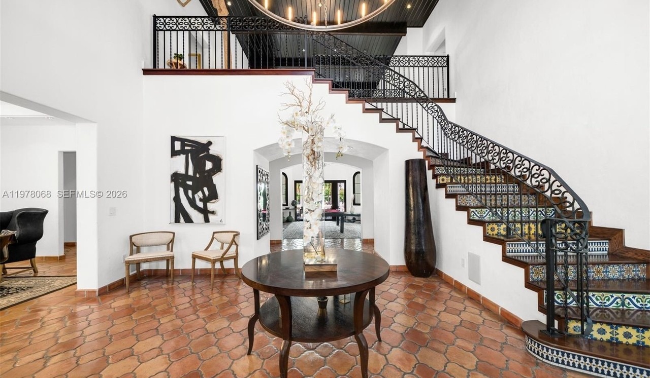 A dramatic two-story Mediterranean-influenced entryway showcasing a sculptural curved staircase with ornate black iron railings and decorative tile inlays, anchored by a striking statement chandelier and warm terracotta hexagonal tile flooring. The space balances traditional arched passageways and crown molding with sophisticated curated furnishings, creating an opulent yet inviting threshold that exemplifies old-world European elegance combined with contemporary design refinement.