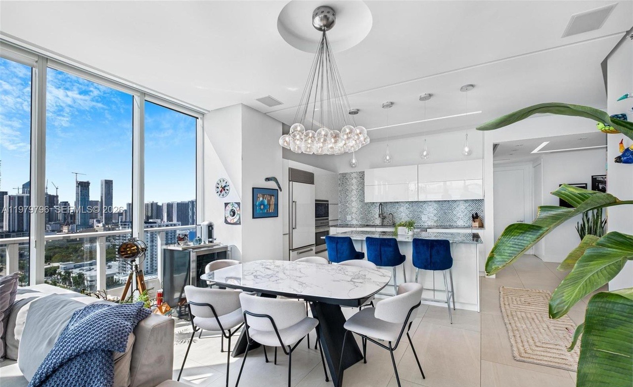 A soaring open-concept kitchen and dining area with floor-to-ceiling floor windows showcasing expansive city views, featuring pristine white flat-panel cabinetry, white marble countertops, a modern mosaic tile backsplash, and striking blue velvet bar stools that add dynamic color contrast. The space is anchored by a sculptural crystal chandelier and complemented by lush green botanical styling, creating a serene yet sophisticated luxury environment.
