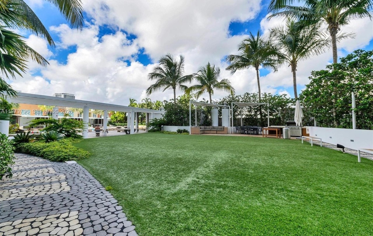 An expansive tropical patio showcasing ultra-luxury outdoor living with a pristine manicured lawn, white pergola structures with integrated lounge seating, and abundant palm tree landscaping. The sophisticated blend of organic materials, clean architectural lines, and carefully curated outdoor furniture creates a serene, resort-like retreat that exemplifies contemporary tropical luxury design.