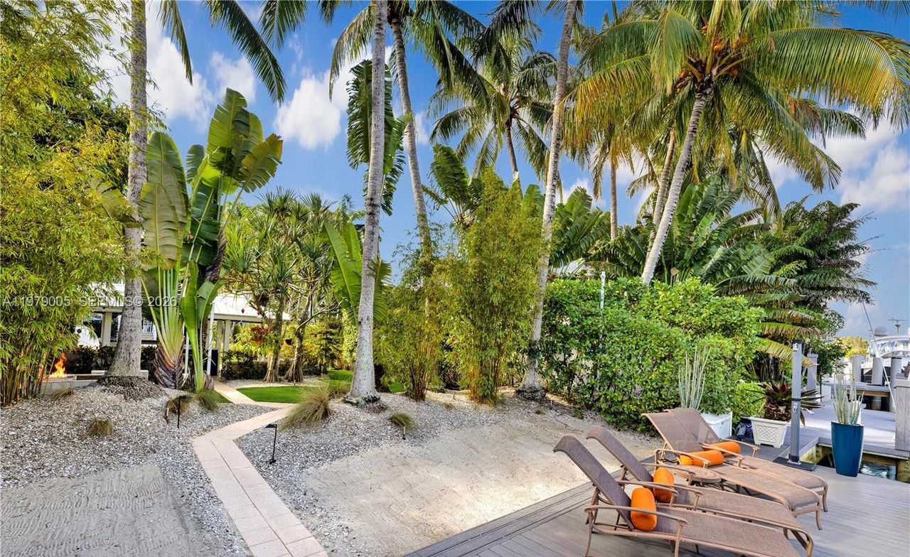 A stunning waterfront pool retreat featuring mature tropical vegetation, white sand beach, and lounging areas with vibrant orange accent furnishings. The lush landscaping of coconut palms, banana plants, and native tropical flora creates an elegant Caribbean-inspired oasis with direct water access, exemplifying high-end resort-style outdoor living.