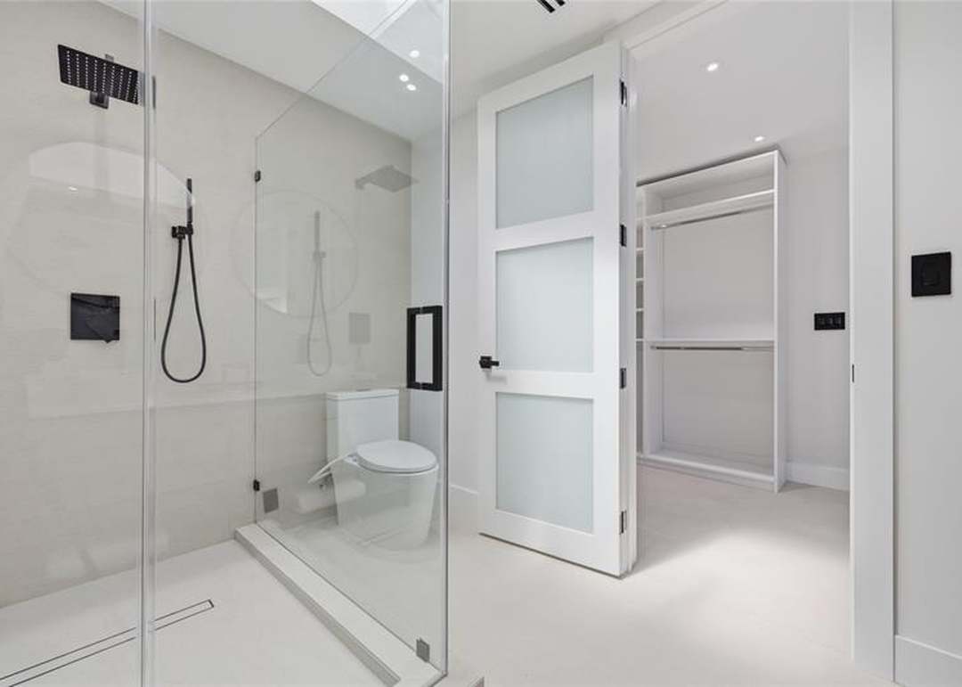 Walk In ShowerFrameless Glass EnclosureRainfall ShowerheadDual Shower HeadsRecessed LightingFloating VanityCustom MillworkFrosted Glass DoorHeated Towel Rack