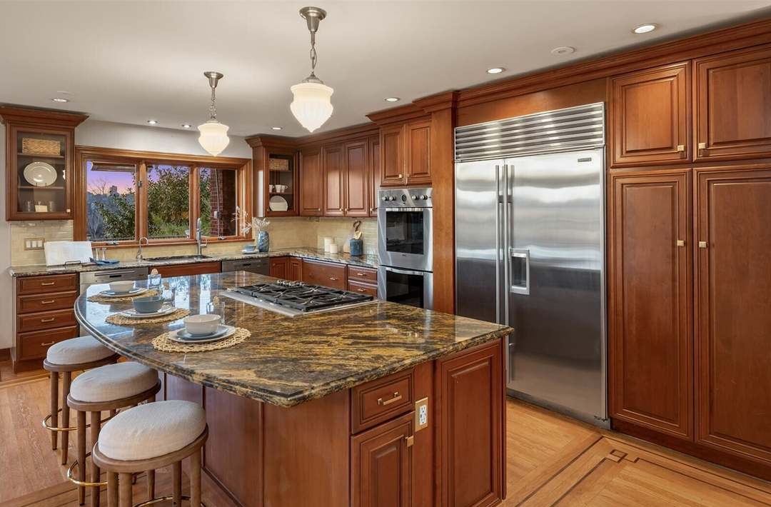 A luxurious transitional kitchen featuring rich dark wood cabinetry and a dramatic waterfall-edge granite island with seating for three, anchored by professional-grade stainless steel appliances and warm brass hardware. The space seamlessly blends traditional architectural details like crown molding and custom millwork with clean modern lines and abundant natural light from oversized windows, creating an inviting yet sophisticated gathering space.