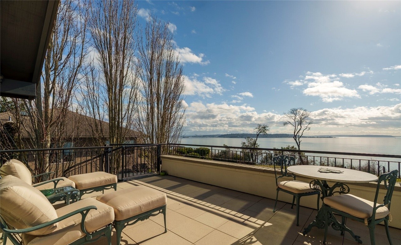 A stunning lakeside patio with panoramic water views framed by elegant tall poplar trees, featuring sophisticated outdoor lounge and dining furniture in cream and sage tones. The space combines clean modern lines with warm natural materials, creating a serene and luxurious retreat that seamlessly extends the living experience into nature.