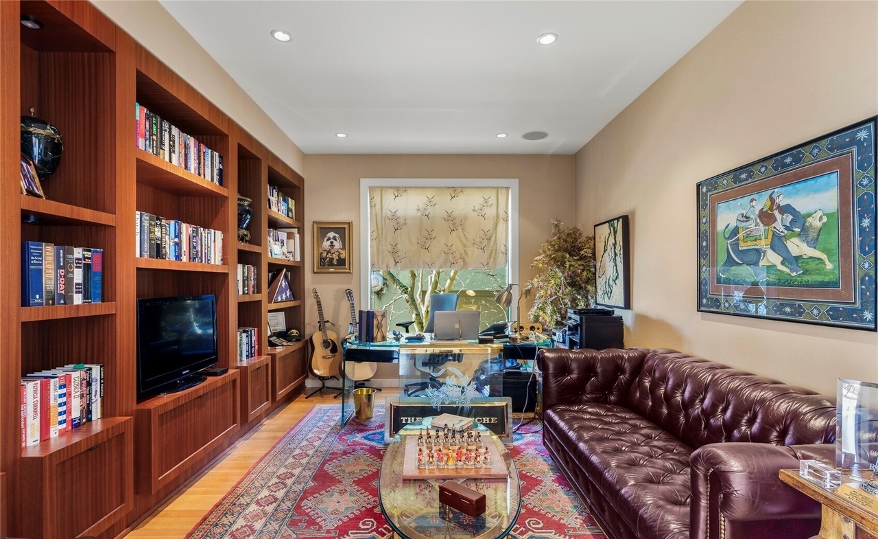 A sophisticated home office library showcasing extensive custom wood built-in shelving with integrated media storage, paired with a leather Chesterfield sofa and elegant furnishings that blend traditional architectural details with contemporary workspace functionality. The warm wood tones, curated art collection, and layered design create an intellectually refined retreat that prioritizes both aesthetics and functionality.