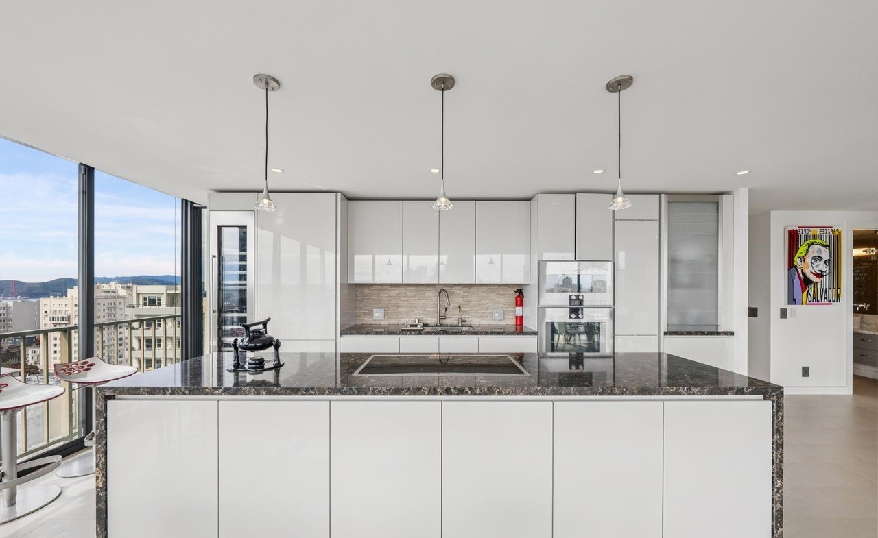 A sophisticated high-rise kitchen featuring a striking white flat-panel cabinetry with a dramatic charcoal granite waterfall island, complemented by a sleek dark stone backsplash and premium stainless steel appliances. Floor-to-ceiling windows flood the space with abundant natural light and showcase expansive city views, creating a serene yet luxurious atmosphere that seamlessly blends modern minimalism with organic warmth.